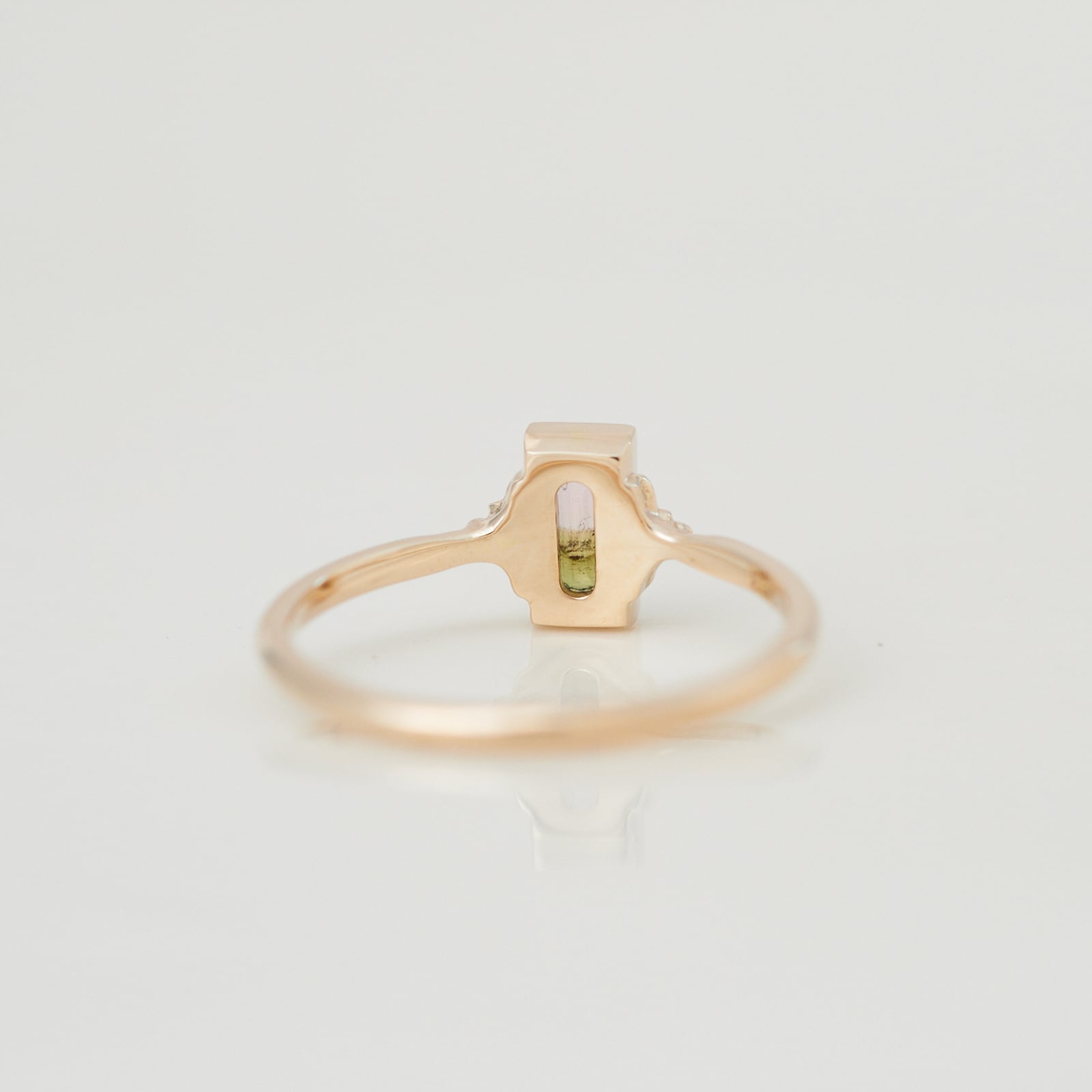 細長いスクエアカットのバイカラートルマリンを華やかなリングに仕立てた「バイカラートルマリン ピンクオリーブ K10YG リング」です。