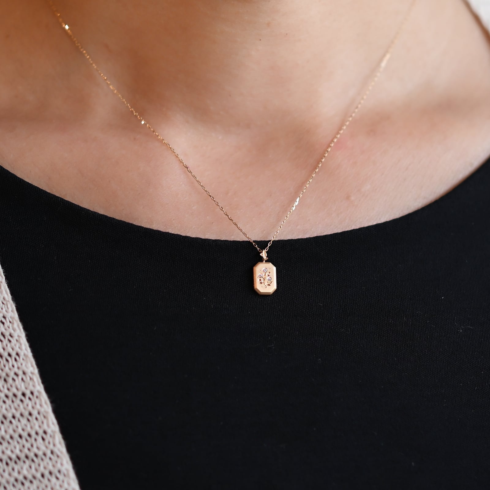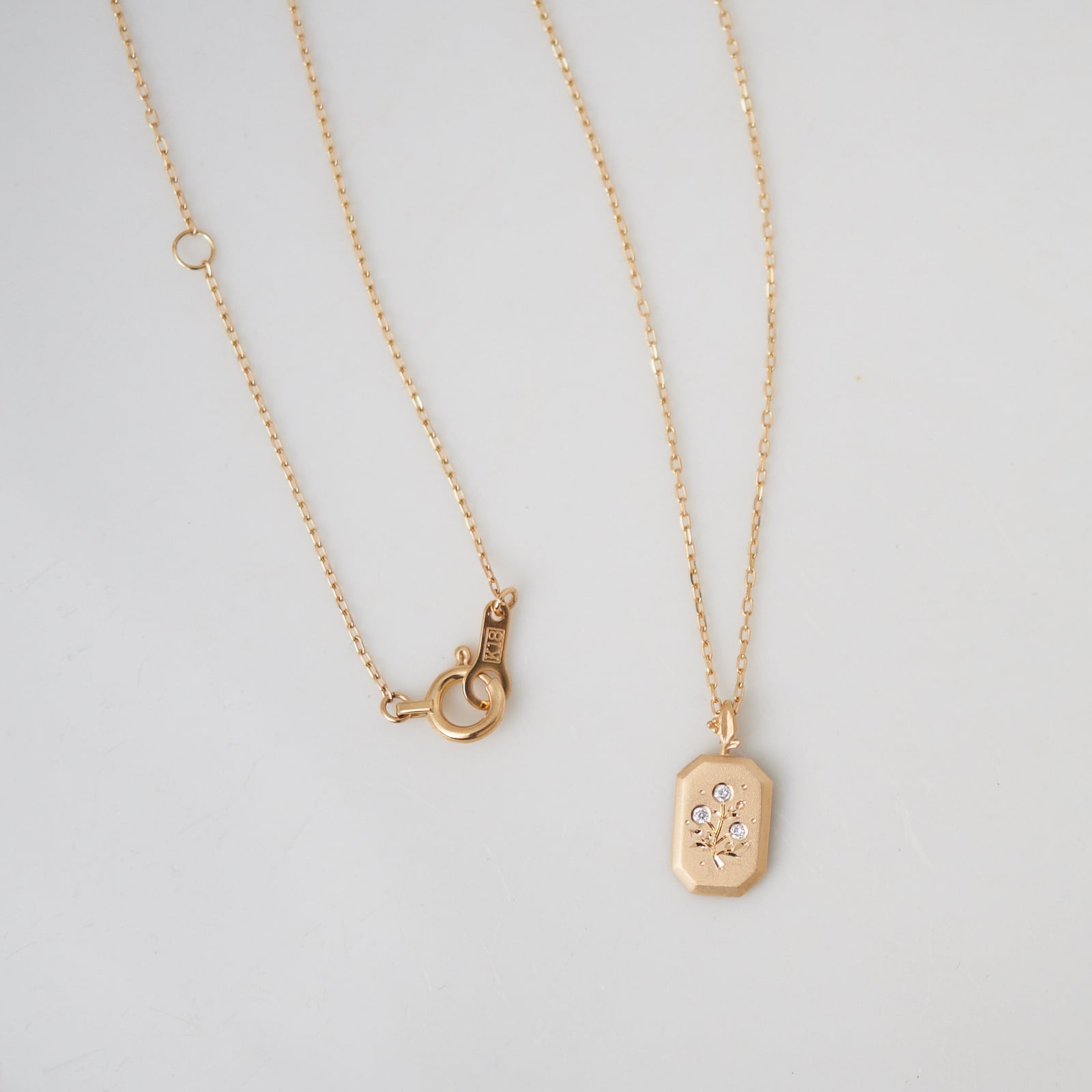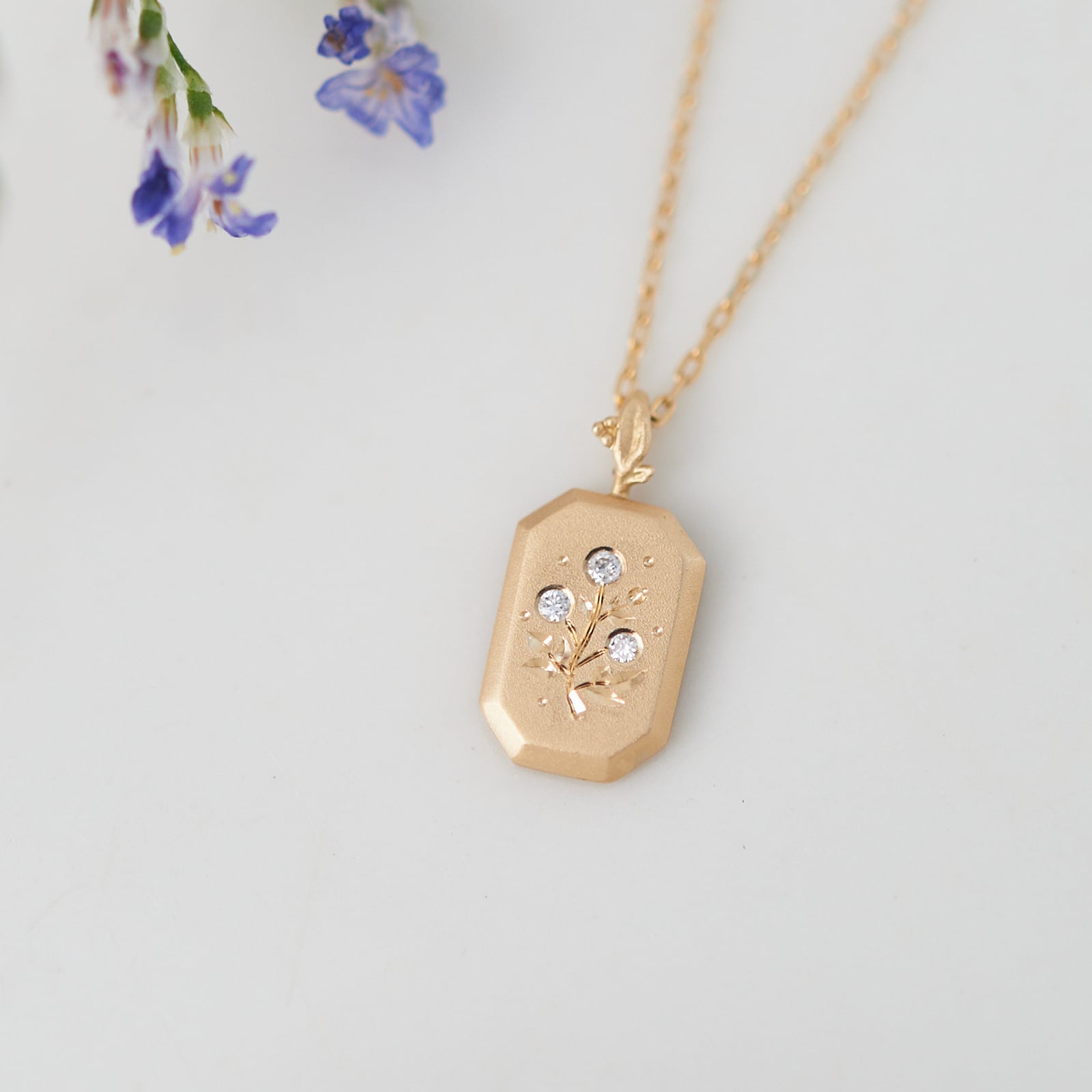 3石のダイヤモンドが野花の彫り模様と共に可愛らしく煌めく「額縁スクエア K18YG プレートネックレス [野花]」です。