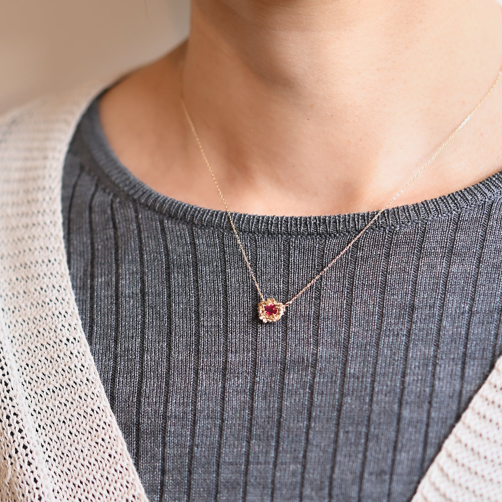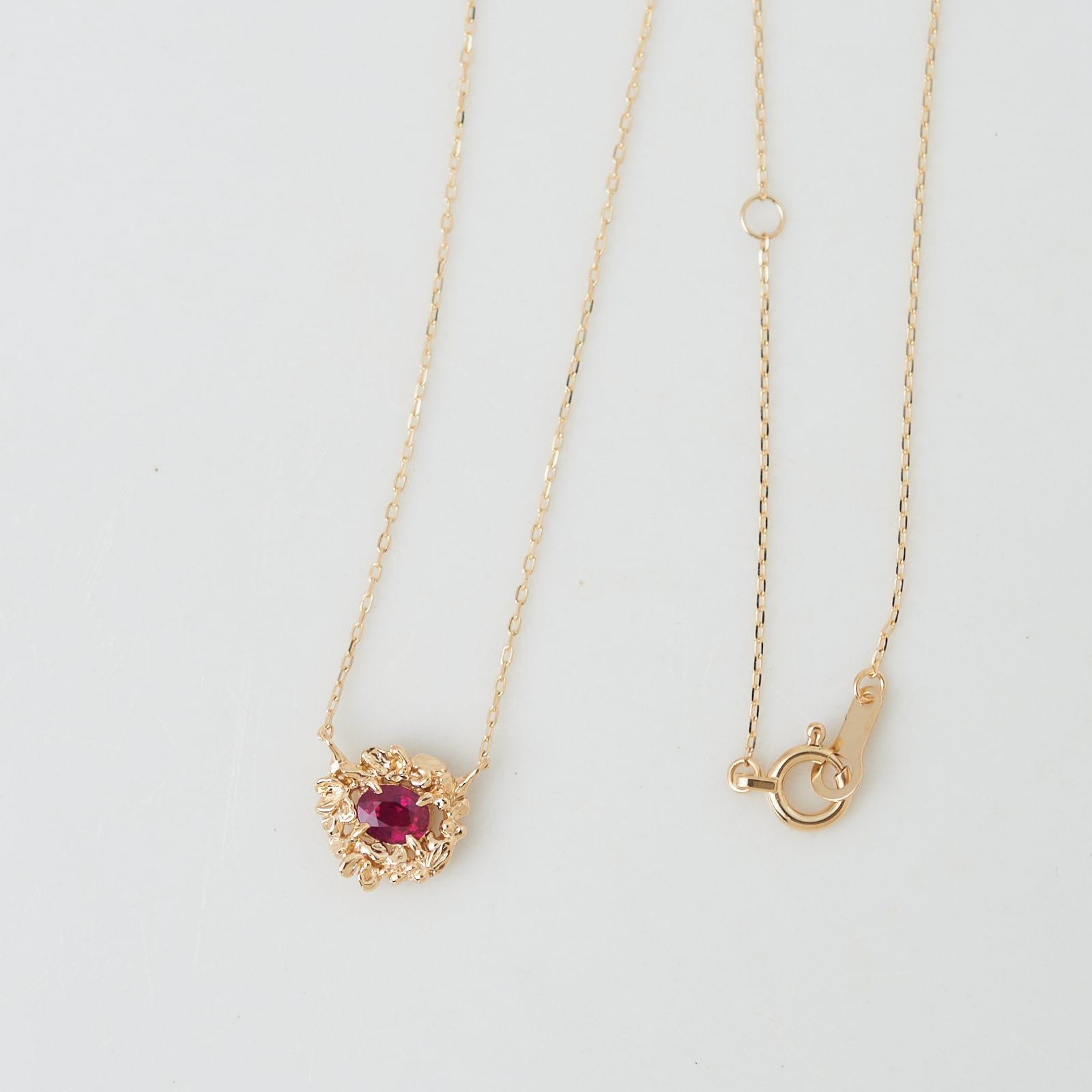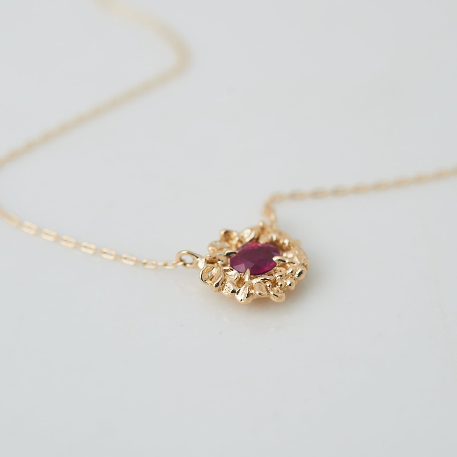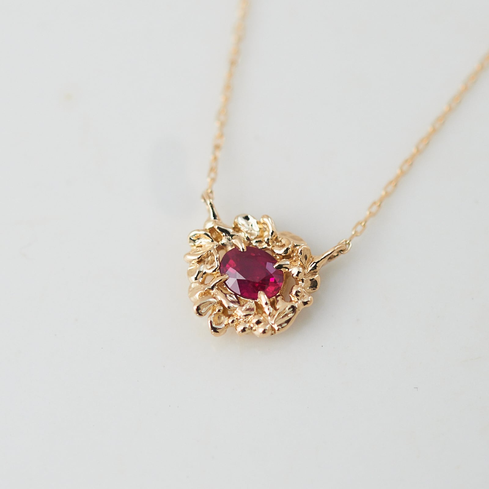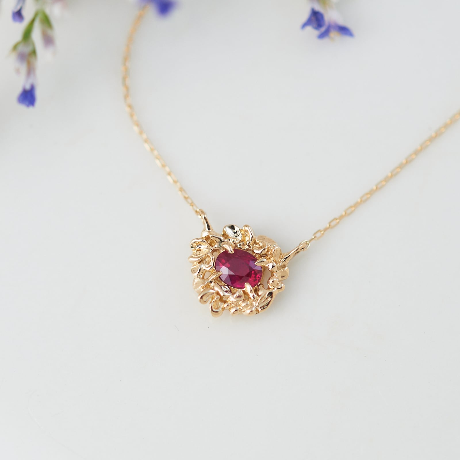 艶やかなピジョンブラッドルビーを華やかに植物で纏った「ピジョンブラッドルビー 艶苺 K18 ネックレス」です。