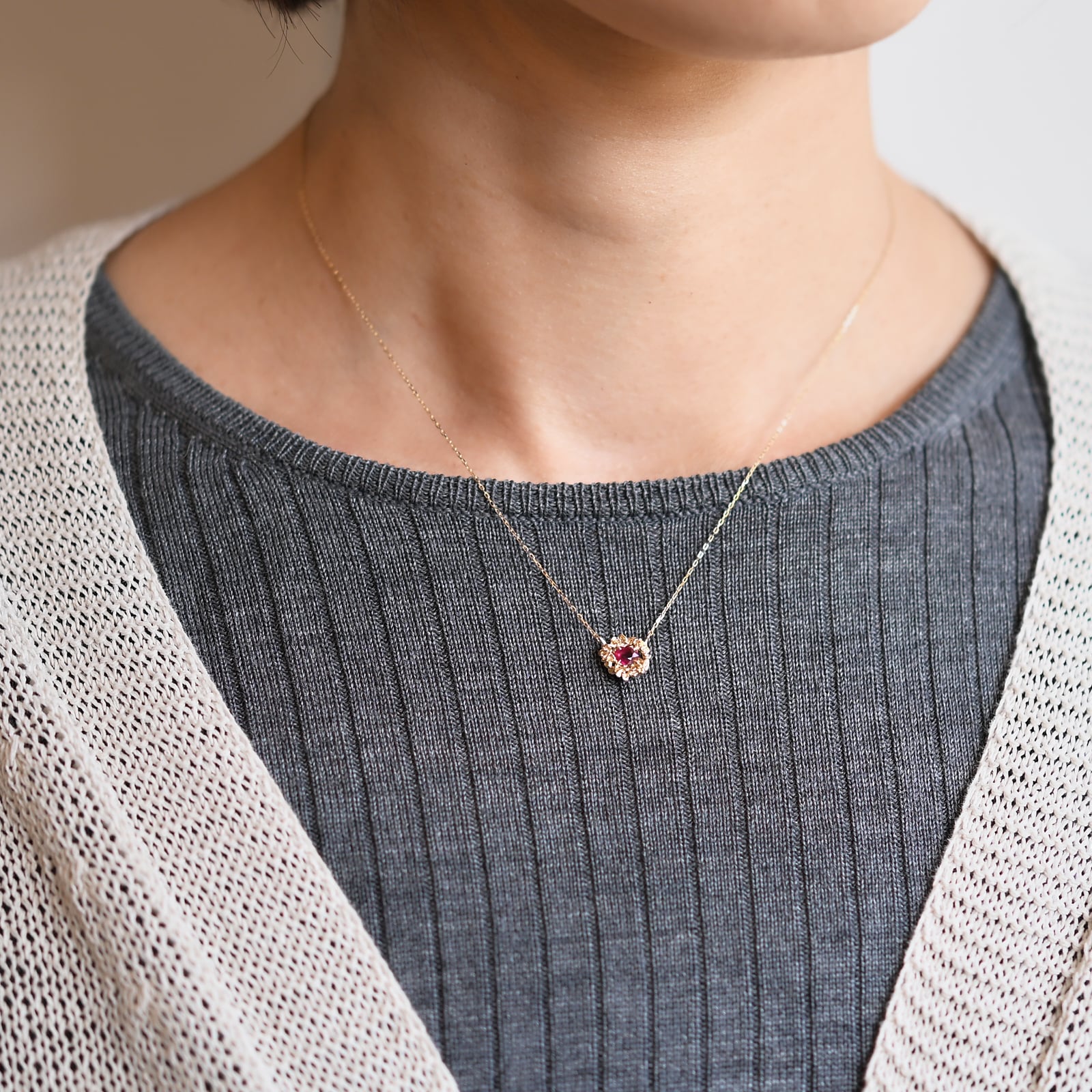 上品で繊細なデザインが目を惹くピジョンブラッドルビーネックレスは、胸元を優雅な彩りを添えてくれると思います。
