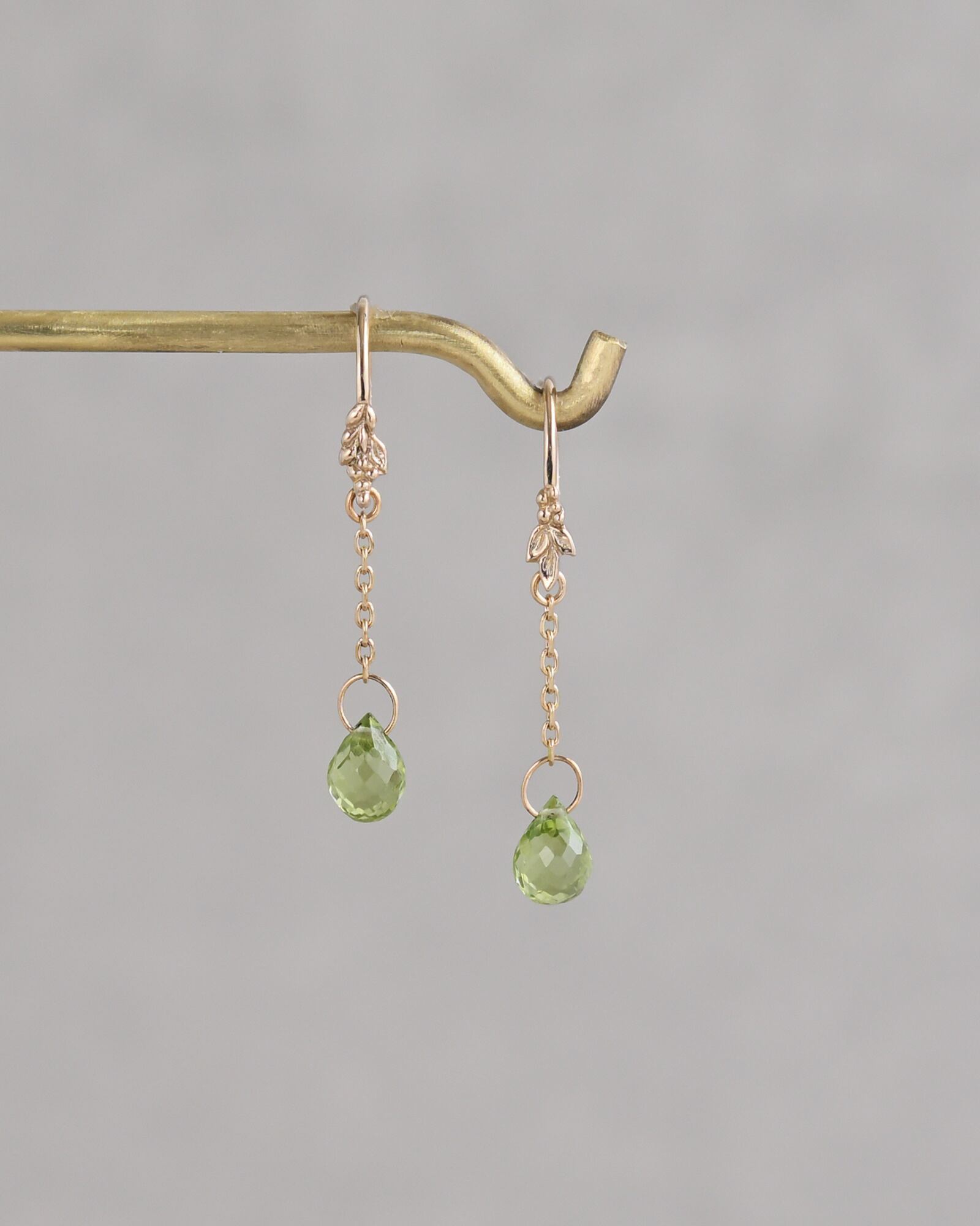 8月の誕生石でもあるペリドット。若草色のようなブリオレットカットのペリドットを程よい長さのチェーンと合わせてデイリーにもつけやすいピアスに仕立てました。